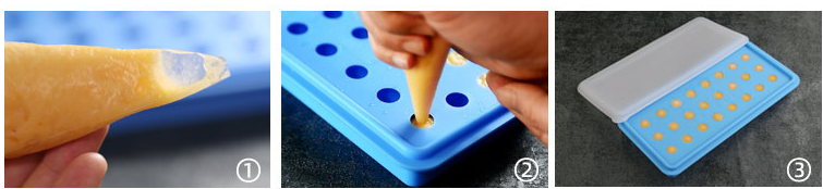 湯圓餡裝入裱花袋之后擠入模具,放進冰箱凍硬后擠壓模具即可脫模。
